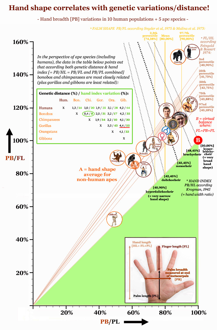 The continuation of this article first presents a picture describing how the 'hand index' correlates with genetic distance between primate species - NOTICE: the green table inside the picture e.g. describes how both the genetic distance and the 'hand index' is relatively small between chimpanzees and bonobos (+ relatively large between gorillas and gibbons). The picture also presents a visual impression of the variation in the 2 aspects of the 'hand index': the finger-aspect [PB/FL] & the palm-aspect [PB/PL]; the proportions for virtual balance are also displayed inside the picture. Then a video is presented displaying how the proportions of the hand have evolved during evolution from a low 'hand index' (featured with e.g. a short thumb & low 2D:4D digit ratio) into a high 'hand index' with the typical 'human digital formula' (featured with a long thumb & high 2D:4D digit ratio). Finally, a table is presented describing proportional data (involving hand shape- & finger proportions) for 19 human populations + 23 primate populations. The article is finished with a quick summary of strongest tendencies among 19 human populations for 5 proportional hand factors. |